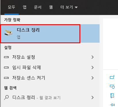 a. 먼저 기존의 임시파일을 지웁니다. [시작버튼]을 누르고 "디스크 정리"라고 키보드로 입력하고 실행합니다.