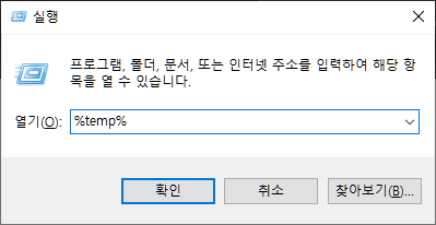 e. 실행창에 "%temp"(따옴포없음)을 입력하고 아래와같이 확인을 누릅니다.