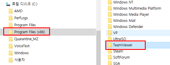 팀뷰어의 경로는 C:\Program Files (x86)\TeamViewer에 위치하고 있습니다. 제거가 안되거나 오류가 발생한 경우 제거하고 새로 설치하면 되는 경우가 있습니다.