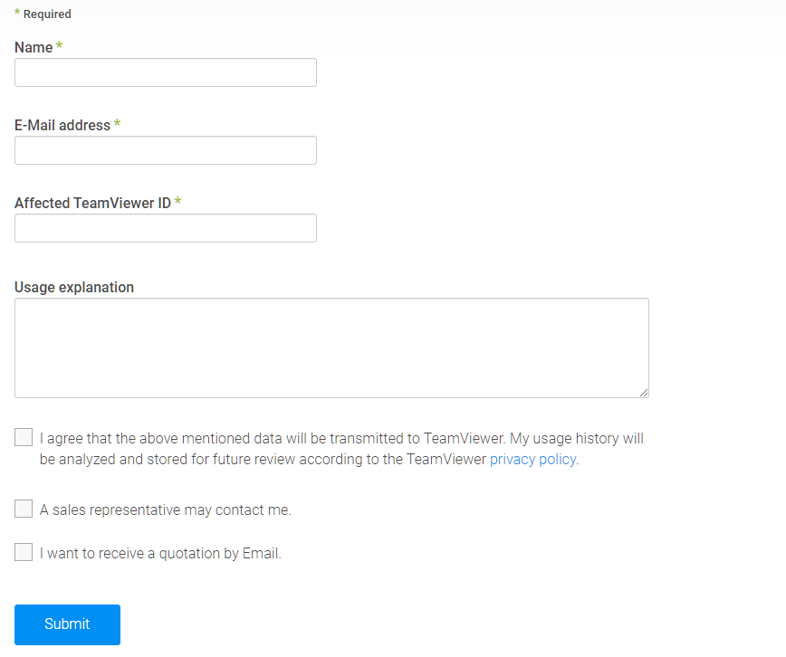 팀뷰어는 7일 이내에 모든 요청을 해결하는 것을 목표로하고 있습니다. 하지만 여러 요청을 보내면 기간이 길어 질 수 있습니다. 양식에는 아래와 같이 이름[Name 필수], 이메일 주소[E-Mail adress 필수], 영향을받는 팀뷰어 ID[Affected Teamviewer ID 필수], 해당 사유[Usage explanation] 등을 기입하면됩니다.