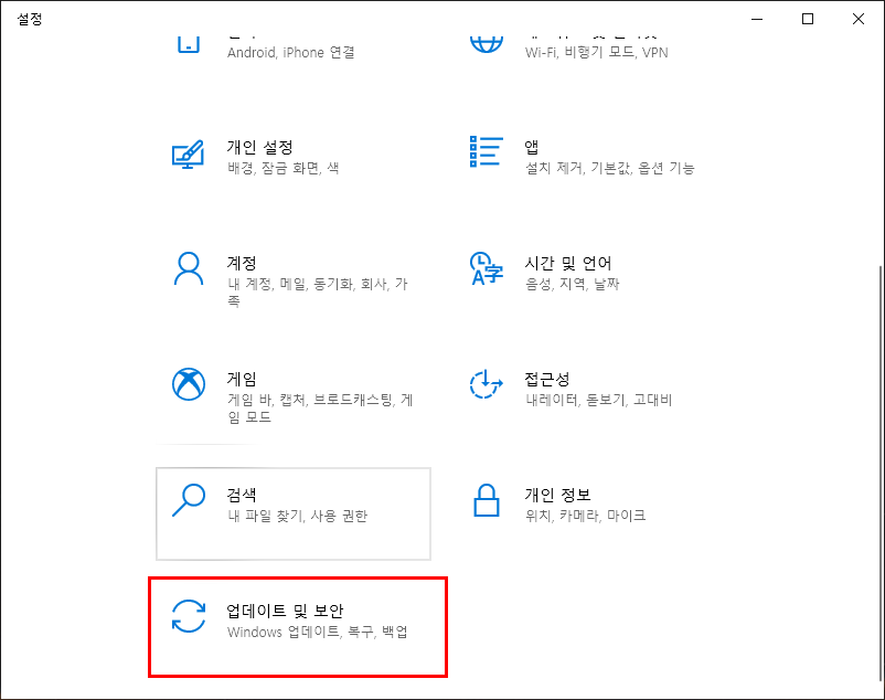 상기의 그림을 보시면 설정 창화면에 [업데이트 및 보안]이라고 있습니다. 마우스 왼쪽으로 클릭하시고, 다음 화면으로 넘어가면 아래와 같은 그림이 나옵니다.